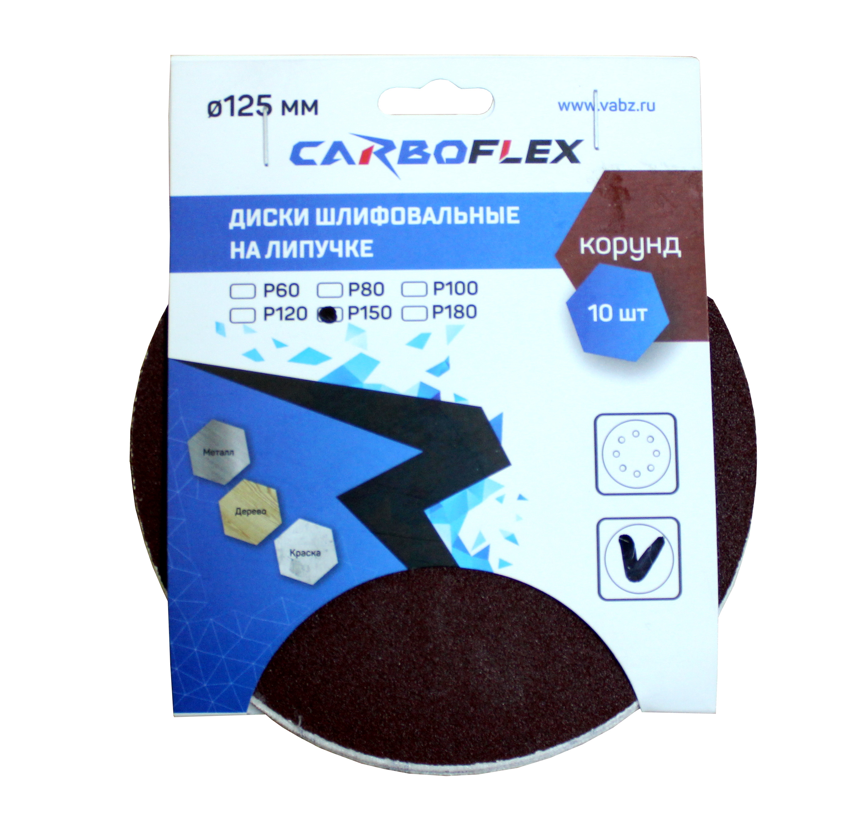 Диск шлифовальный на липучке Сarbofleх D125 10 шт представляет собой круг из специальной водостойкой бумаги, покрытый жидким бакелитом, который удерживает абразивный материал электрокорунд (оксид алюминия).